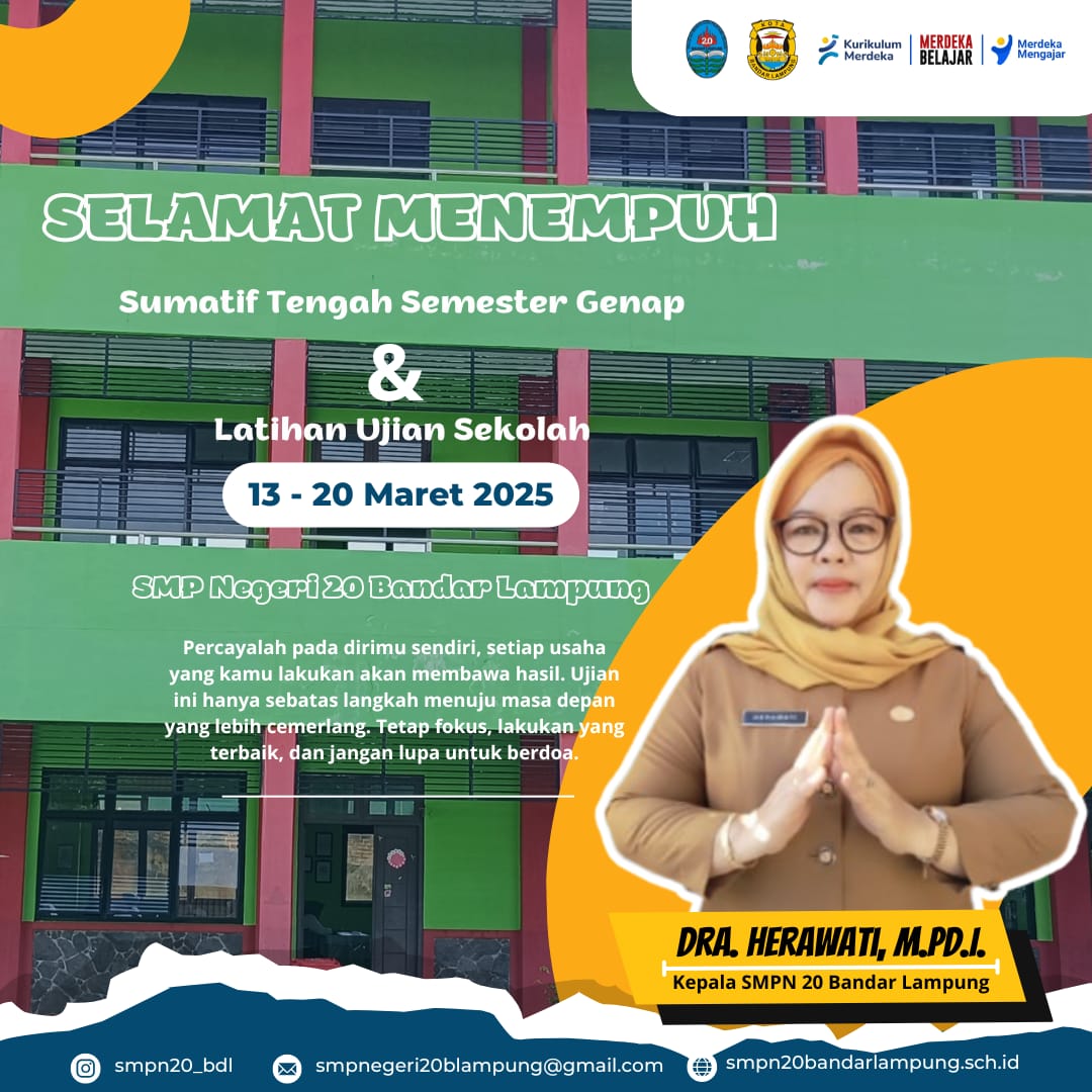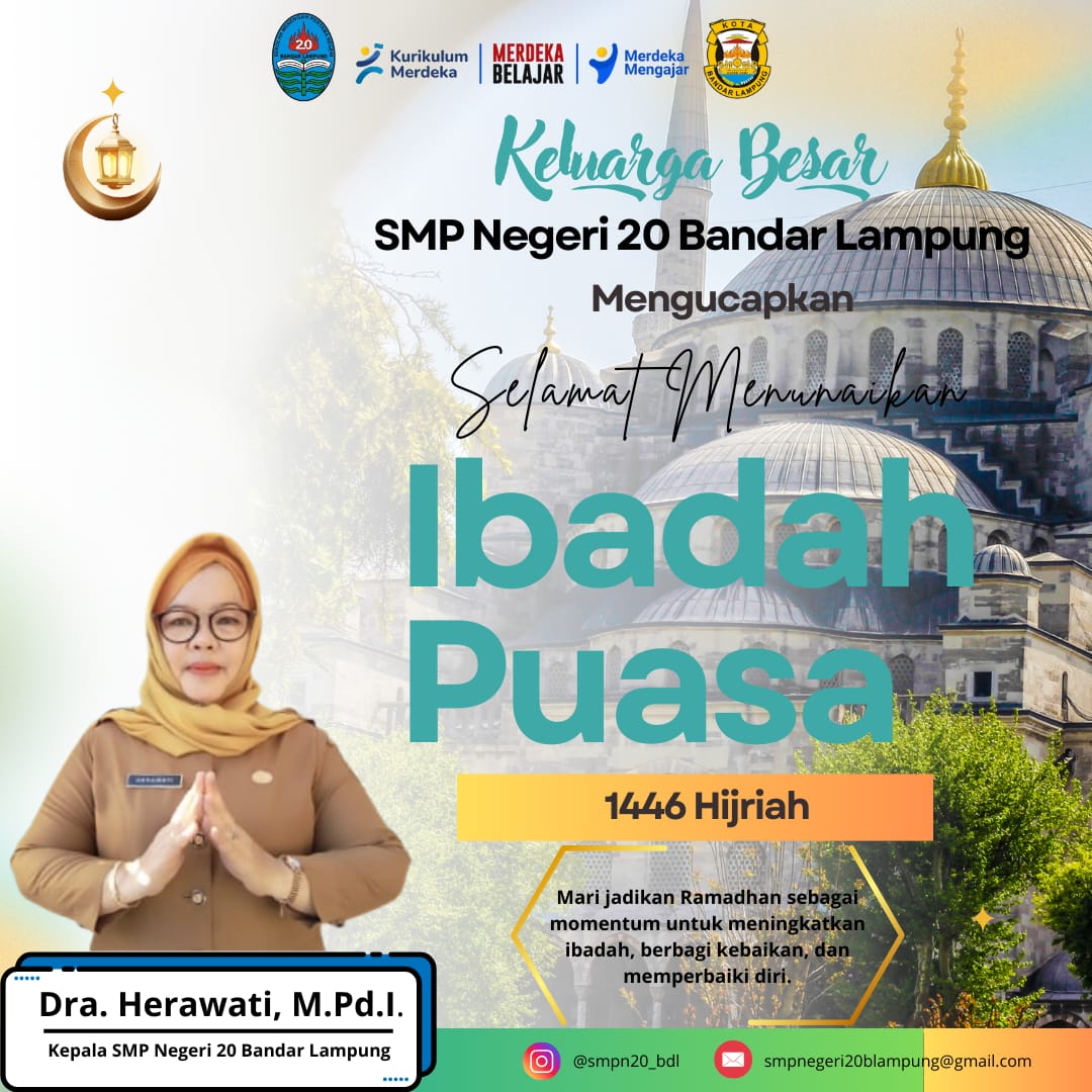 SMP NEGERI 20 BANDAR LAMPUNG merupakan sekolah yang menawarkan pendidikan berkualitas terakreditasi A dengan Nomor SK Akreditasi 580/BAN-SM/SK/2019 tanggal 2 Juli 2019 dan tersertifikasi ISO 9001:2008. Kepala Sekolah SMP NEGERI 20 BANDAR LAMPUNG saat ini adalah Dra. HERAWATI, M.Pd.I